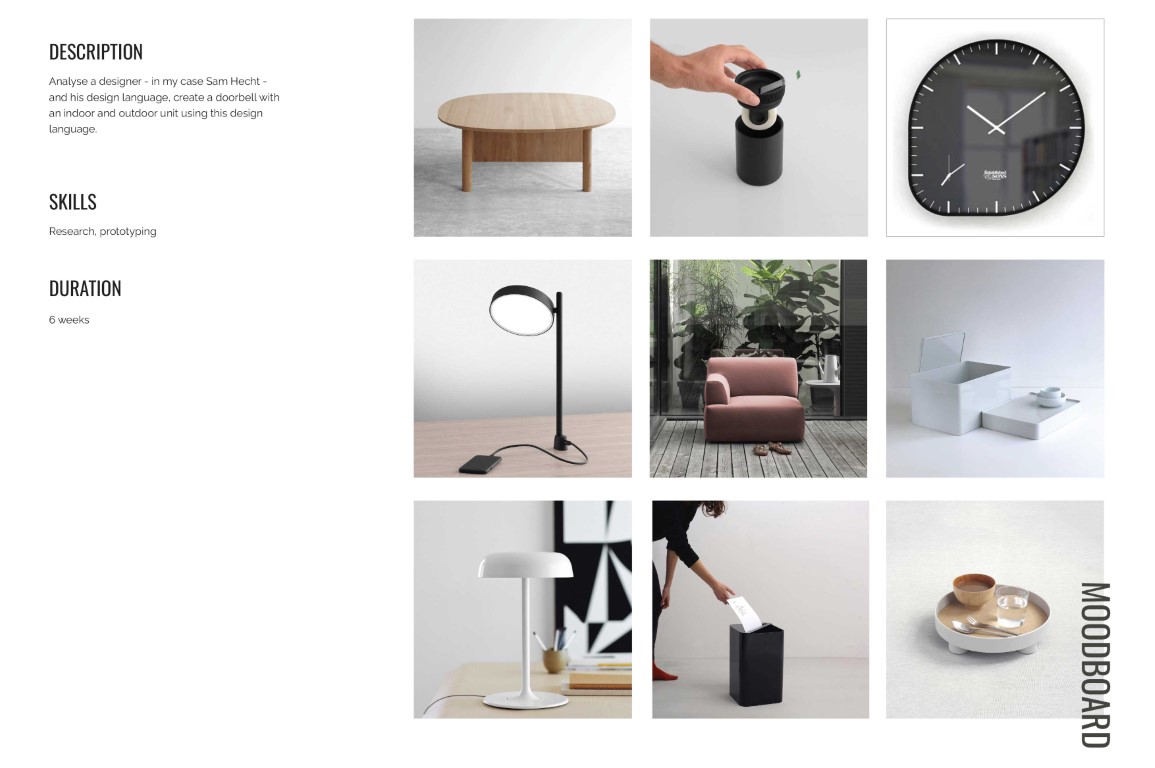 For this assignment we needed to analyze a designer, research doorbells and build a doorbell consisting of an indoor and outdoor unit, using the designers design language
