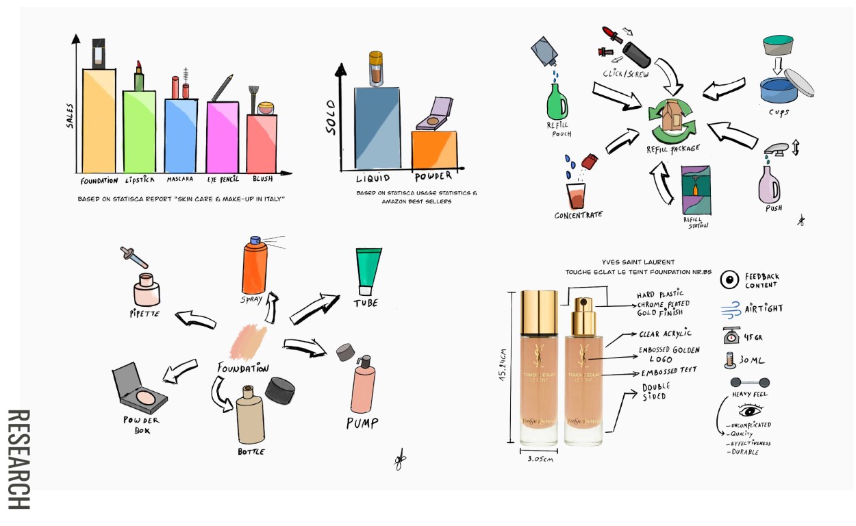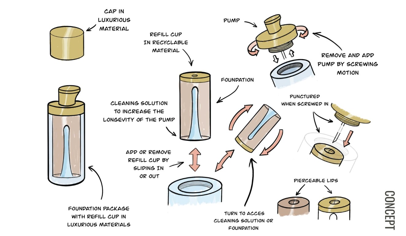 Refillable make-up Moodboard Research Concept Scenarios Sustainability Prototypes Visualisations Refillable make-up Project We where tasked with creating a refillable make-up bottle with an approach that was focused on sustainability. This in collaboration with the plastics company Eastman Techniques Research, Prototyping, Rendering